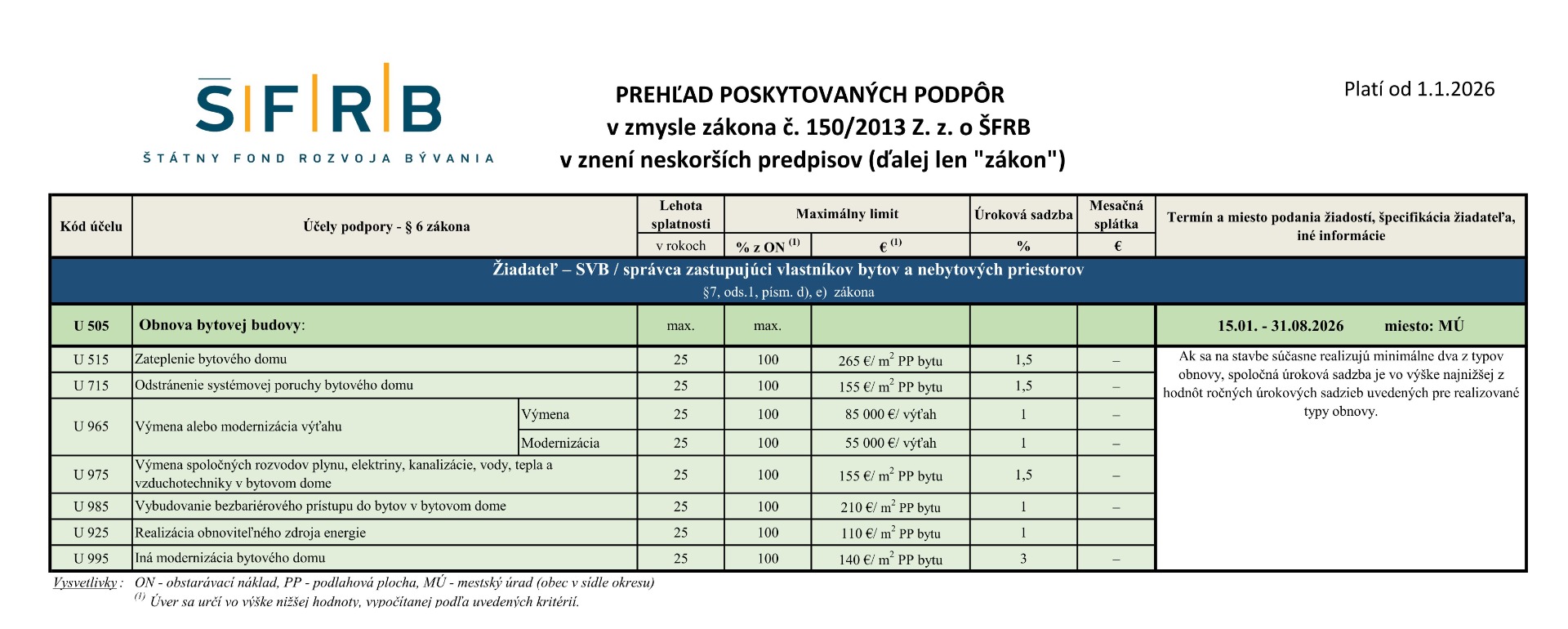 Vyhláškou č. 410/2023 Ministerstvo dopravy Slovenskej republiky z 13. októbra 2023 mení s účinnosťou od 1.1.2024 podmienky poskytovaných podpôr v zmysle zákona č. 150/2013 Z.z. o ŠFRB.